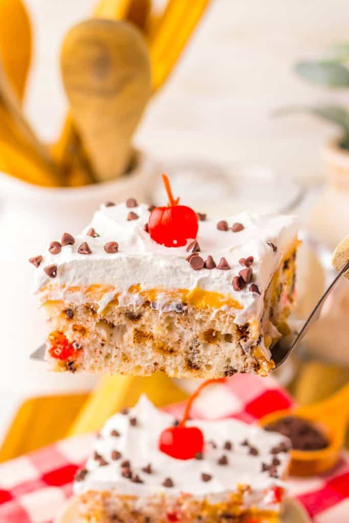 Add sliced bananas when serving it for a fun twist on a banana split. This cake has everything else from a banana split, so it’s an easy addition.