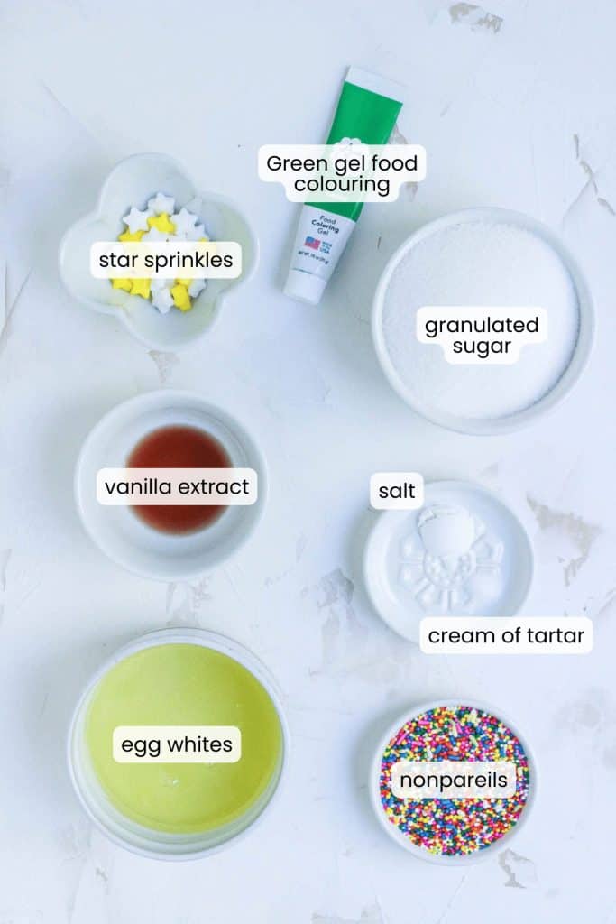 Light, crisp, and perfectly festive, these meringue Christmas trees are tinted green and decorated with sprinkles for a sweet holiday treat.