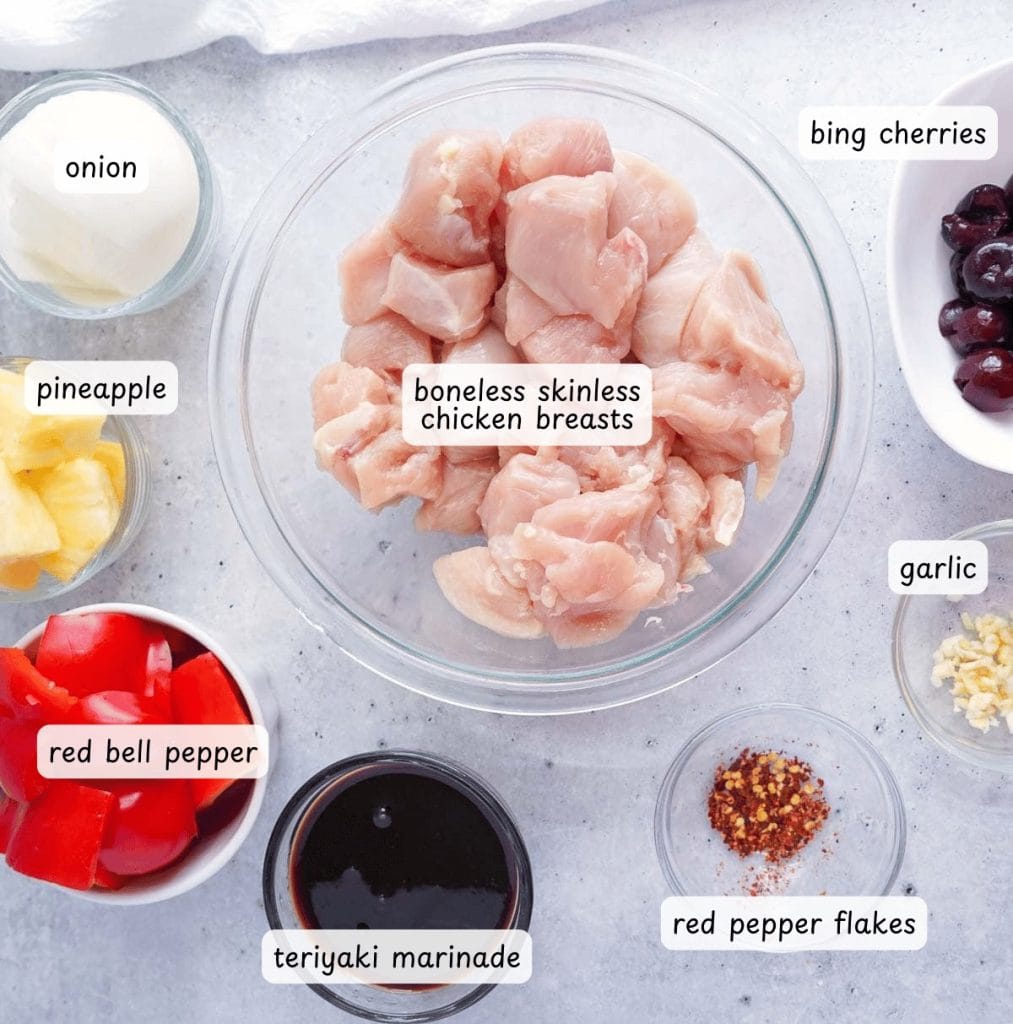 - In a large bowl or zip-top bag, combine chicken, teriyaki marinade, garlic, cherries (if using), and red pepper flakes