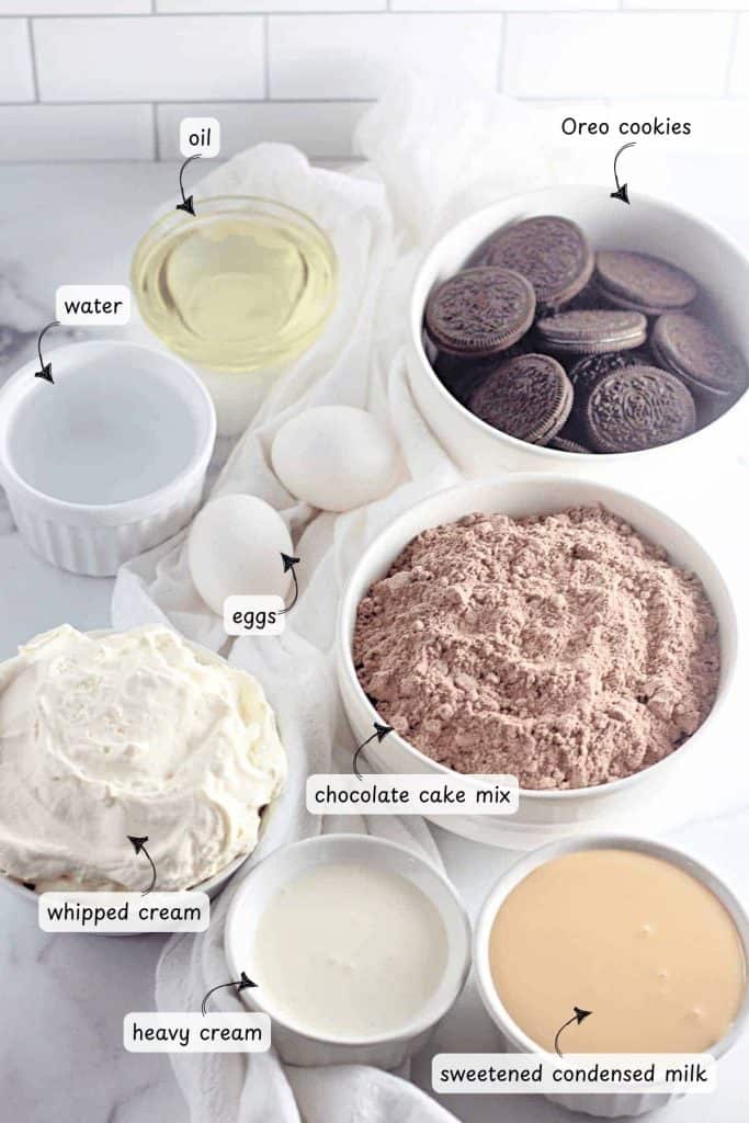 This cake is all about simple ingredients that work together for an indulgent, cookies-and-cream-inspired dessert. The cake mix makes it quick, the sweetened condensed milk and heavy cream add richness, and the Oreos bring the perfect crunch.