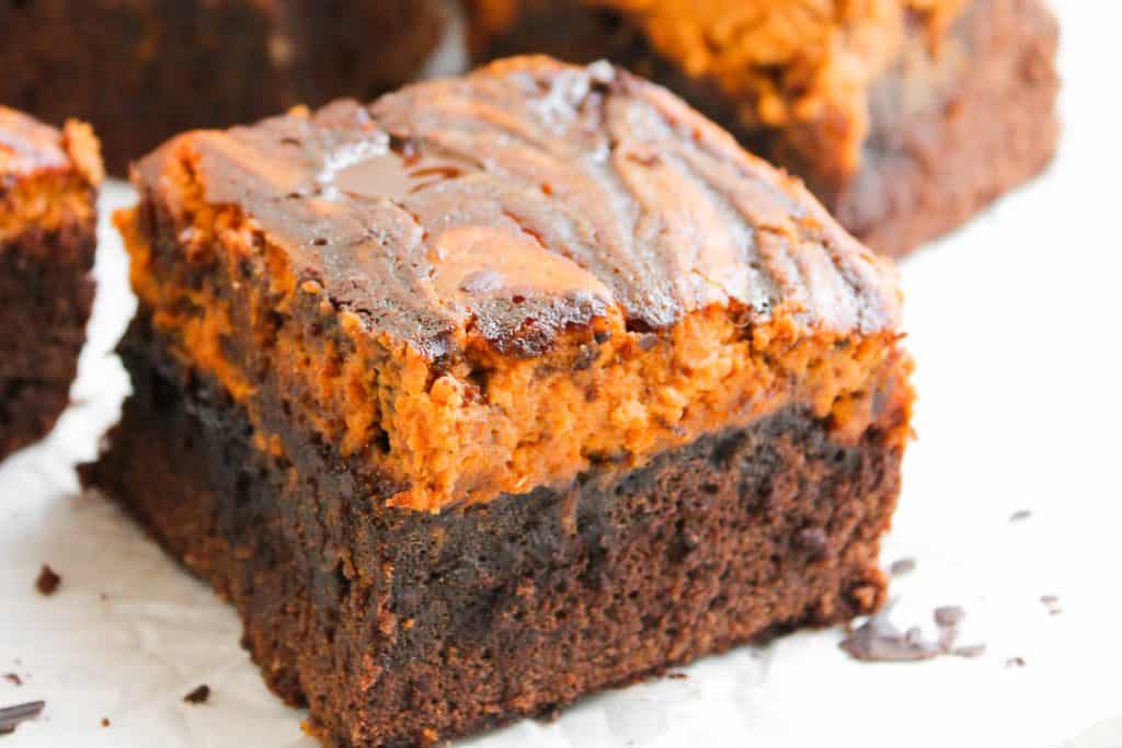 The rich brownie base is fudgy and chocolatey, while the pumpkin cream cheese layer brings in a smooth, spiced flavor. Chopped dark chocolate adds little pockets of extra richness throughout. Every bite is a mix of soft brownie and pumpkin spice cream cheese.